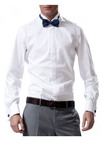 Сорочка мужская полуприталенного силуэта. Воротник wing (под бабочку). Длинные рукава с манжетами как под запонку, так и под пуговицу. Застежка спереди на пуговицы, без кармана, плотная ткань.