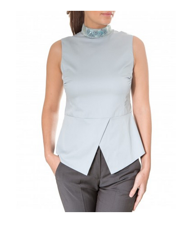 Топ из хлопка-стретч Albini (Италия), с застежкой на пуговицах сзади. Основной акцент топа на декоративном воротнике-стойке,украшенном бусинами.Деталь собрана вручную в Италии. Дополняют топ мягкие складки на рельефах и сложная баска.