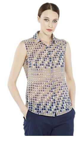 Блуза из воздушной полупрозрачной ткани креп-шифон. Прямого силуэта, с боковыми разрезами, без рукава. Супатная застежка. Прекрасное дополнение к вашему жакету. Геометрический принт с оптическим эффектом создает иллюзию воздушности и полета, оставляя за собой незабываемый образ.