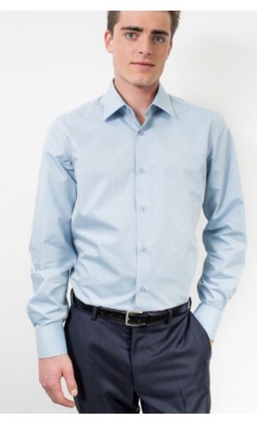 Однотонная мужская сорочка серо-голубого синего цвета. Прямой силуэт, классический воротник, манжета под пуговицу. Комфорт и удобство на каждый день.