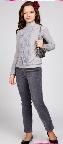 Брюки зауженные к низу, с накладными карманами, из вельвета. Комфортная и практичная модель. Легко комбинируется с блузами, водолазками и кофтами из коллекции. Удобно заправлять в высокие сапожки. Предлагается в мягком сером цвете