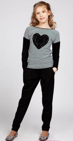 Блуза из трикотажных компаньонов, с аппликацией "сердце". Стильная "взрослая" модель для юных модниц. Хорошо сочетается с брюками, джинсами и юбками черных и серых оттенков.